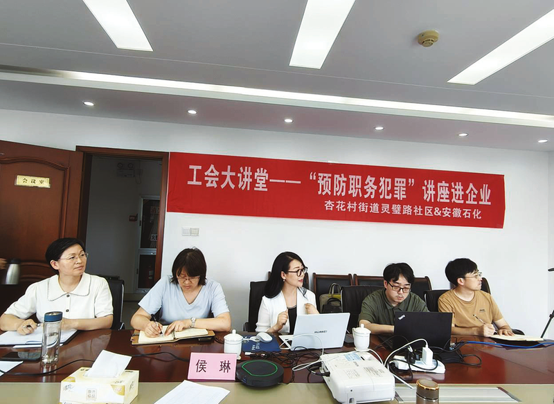 本报讯 为进一步提高企业职工的法律意识和廉政意识,增强拒腐防变能力,从源头上遏制和减少职务犯罪的发生,近日,合肥市庐阳区杏花村街道灵璧路社区工会、商会、司法、综治等部门在辖区驻地单位安徽省化工研究院开展了一场以“工会大讲堂之预防职务犯罪”为主题的普法专题讲座。