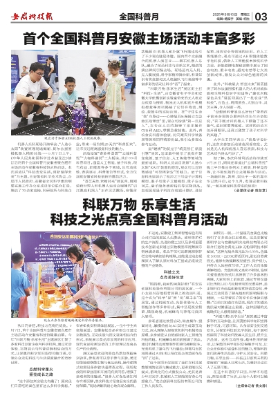 活动设置“奇妙科普荟”“云端科普悦”“大咖科普说”三大板块,共计66项科普项目,涵盖人工智能、量子科技、现代农业、新能源等多个领域,以互动体验、表演展示、科普报告等形式,全方位展现安徽省科技创新的蓬勃活力。