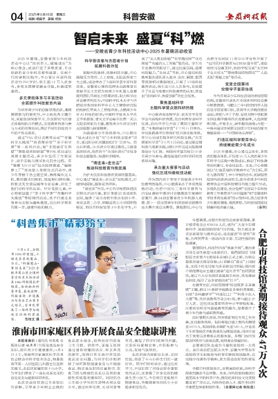 2025年暑期,中心通过立体化、多层次的服务体系,不仅使1.5万人次的青少年在科学与实践中收获成长,推动了科技教育向均衡化、专业化迈进。未来,中心将继续以“打造区域科学教育中心”为目标,深化与教育部门、中小学校的合作,拓展服务范围与创新活动形式;联合省青少年科技教育协会开展科技辅导员能力提升行动,加强队伍建设,充分发挥“全国青少年科技教育工作者培训与实训基地”和“安徽省科学技术普及基地”的示范作用,助力更多青少年激发潜能、成就梦想,为科技强国建设储备科技后备力量。 (安珂)
