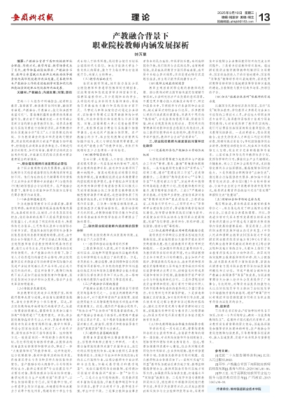 由于职业教育特定的类型属性,高职院校教师与其他普通高等院校的教师具有明显的不同。他们内在的成长无疑需要同时聚焦于工业和企业所需的专业技能(产)与教育技巧(教)的紧密结合与协同进步。在产教融合背景下,教师社会职能和知识传授方式等变化要求教师内涵发展。