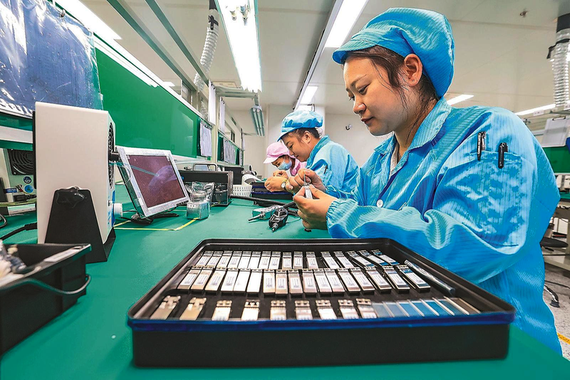 近日,马鞍山经开区高新企业安徽共芯光子科技有限公司生产线上,工人在生产应用于5G基站上的光模块产品。