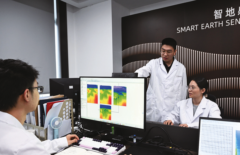9月9日,在智地感知(合肥)科技有限公司,研发人员黄兴国(中)与王紫秀(右)正在讨论地下成像结果。分布式光纤声波/振动传感技术,是近年来刚刚发展起来的一种新型振动监测技术,可实现单根光纤对沿线的声波/振动进行长距离、宽频带、高精度感应(感应、传输一体)。位于“科大硅谷”的智地感知(合肥)科技有限公司团队通过利用既有的城市通信光缆,收集城市地下背景噪声,并结合背景噪声成像技术,就像是给大地“做B超”,最终可实现对城市地下结构的三维精细刻画打造出城市地下地图。 张大岗 摄