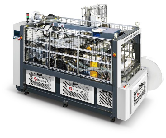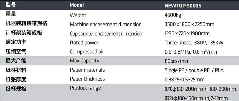 NEWTOP-5000S型高速智能超大型纸杯机采用台式布局,将成型模具与传动部分隔开。