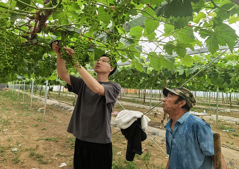 萧县白土镇张村驻村工作队和群众一同对大棚葡萄进行梳果。