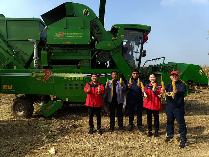 萧县刘套镇三大家村驻村工作队协调中国石化安徽石油分公司捐赠大型收割机帮助村民抢收玉米。