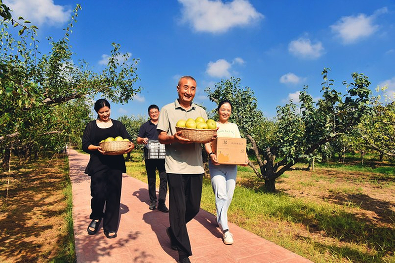 砀山县良梨镇马庄村第一书记袁兴涛(中)与村民一道采摘酥梨,共享酥梨丰收的喜悦。
