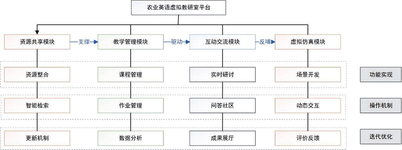 图2:农业英语虚拟教研室平台建设模块 摘要:本研究聚焦农业英语领域,深入探讨虚拟教研室建设。通过整合“云连接论”“学习型组织理论”等前沿理念,构建了以行业需求为导向、以跨校协同为手段、资源共享为支撑、特色发展为目标的虚拟教研室模式。研究团队经过两年实践,在资源整合、教学创新、教师发展及人才培养等方面取得显著成效,为农业英语教学改革及同类虚拟教研室建设提供了可借鉴的理论框架与实践范式。