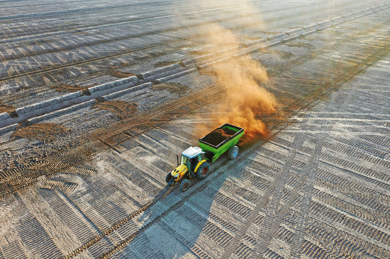 10月23日,位于宿松县的安徽农垦华阳河农场高标准农田里,农机手驾驶大型机械抛撒有机肥,实施土壤改良。近年来,华阳河农场积极推进绿色农业发展,选用畜禽粪便、腐熟的秸秆等有机肥抛撒还田,减少化肥用量,改善土壤团粒结构,增加土壤有机质,提升耕地质量,推动农业绿色循环发展。
