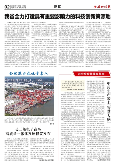 多重国家战略叠加优势充分发挥,成为全球创新网络的重要节点。我省联合沪苏浙制订通过全国首个以科技创新协同发展为主题的区域立法。深化上海张江、合肥综合性国家科学中心“两心同创”,共建长三角大科学装置集群。