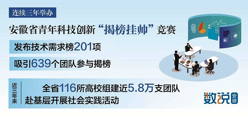 聚焦“卡脖子”技术攻关与产业发展需求,举办安徽省青年科技创新“揭榜挂帅”竞赛,累计发布技术需求榜201项,吸引639个团队参与揭榜,成功破解科大讯飞、国盾量子等企事业单位技术难题74项。