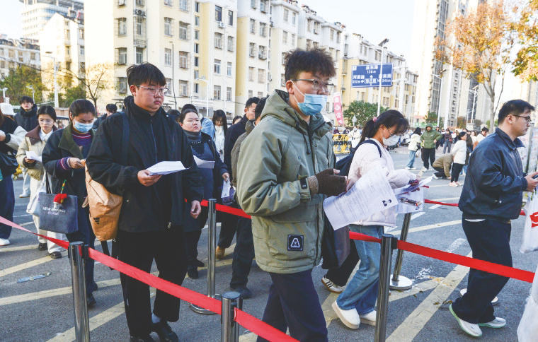 11月30日,中央机关及其直属机构2026年度考试录用公务员笔试举行,共计划招录3.81万人。作为打破“35岁门槛”的首次国考,本次招录将报考者年龄上限放宽至38周岁,应届硕士、博士研究生年龄上限放宽至43周岁。图为,在安徽省阜阳师范大学附属西清路中学考点,考生入场参加公共科目笔试。 卢启建 摄