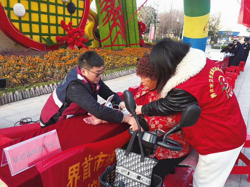 12月1日“世界艾滋病日”当天,界首市疾控中心在广场开展主题科普活动,志愿者为骑行而来的市民测量血压,医护人员同步宣传防艾科普常识。这场活动将防艾科普融入便民服务,既传递了健康知识,也将关爱落送到了群众身边。