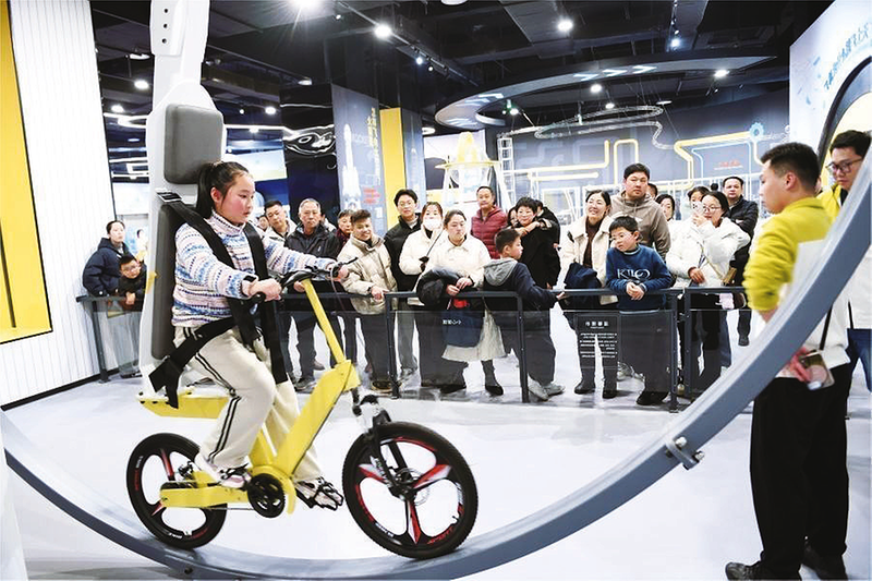 12月13日,小朋友在淮南科技馆体验360度自行车项目,感受科技魅力。据悉,淮南科技馆日前开馆,共设有六个常设展厅,展品总数311件,市民通过模型操作、多媒体、科普剧场等互动体验,学习科技知识,提升科学素养。
