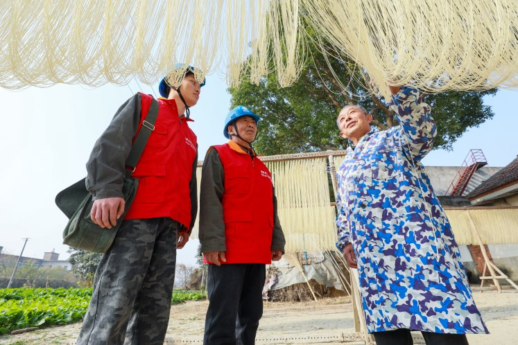 12月11日,国网安徽电力肥东县供电公司员工走进合肥市肥东县八斗镇花张社区手工挂面经营户王登前的生产作坊,走访了解挂面制作环节用电情况,开展加工设备、照明装置安全检查,保障当地特色农副产品生产用电可靠。