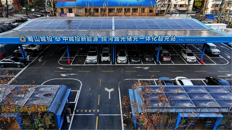 12月15日,在合肥市蜀山区拍摄的皖河路光储充一体化综合能源站。蜀山区皖河路光储充一体化综合能源站在车棚顶部配备了高效光伏组件,年均发电量约25万度,配合储能系统,可实现“自发自用、余电存储”的能源“削峰填谷”目标。同时,站内共配置57个车位,其中新能源充电车位24个,可满足私家车、物流货车等不同车型的充电需求。 陈三虎 摄