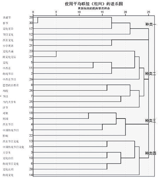 根据图1,可将聚类结果分为四类(见图)。种类一:圣诞节、春节、文化差异、节日文化,并将西方文化与小学英语归于此类,以春节和圣诞节为关键因子。种类二:以中西方节日和跨文化交际为关键因子;种类三:以原因、对策、影响为关键因子;种类四:以文化认同和中国传统节日文化为关键因子。