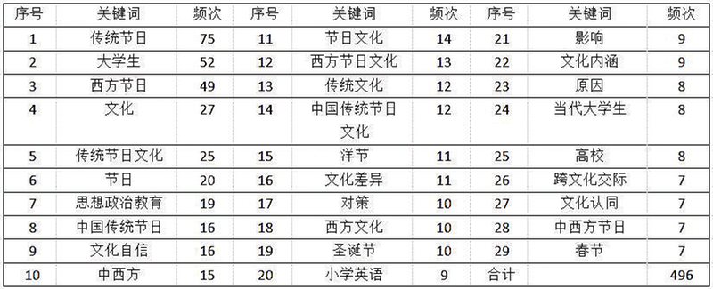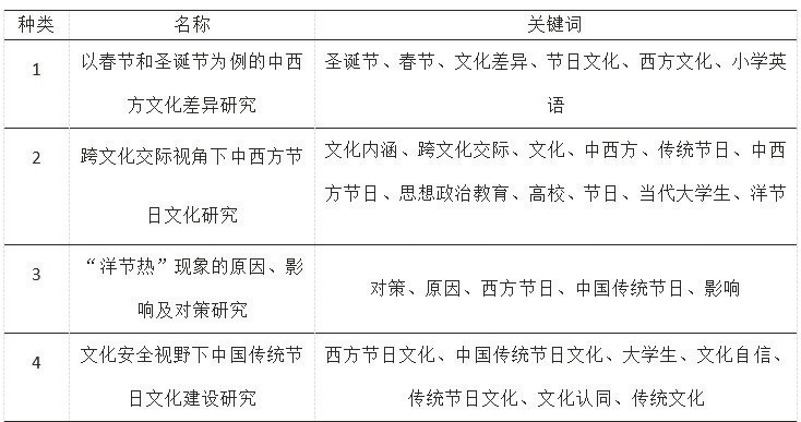 通过分析得出,我国“洋节热”现象的相关研究主要围绕四大领域展开,但又不够明确四大领域之间的关系。因此本文围绕关键因子进行定义,得出我国“洋节热”现象相关研究分布的四大领域为:以春节和圣诞节为例的中西方文化差异研究,跨文化交际视角下中西方节日文化研究,“洋节热”现象的原因、影响及对策研究,文化安全视野下中国传统节日文化建设研究。
