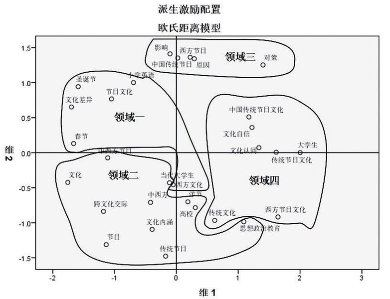 由图可知,领域二所占面积最大、概括的种类最多,并且与领域一距离极近,可见领域一、二作为同一条研究主线的两个领域,有着密切联系,并且研究密度较大,研究热度较高。同时,领域一、二主要分布于第二、第三象限,第三部分也有涉及,但未分布于第一象限。可见,该主线下的两个领域研究范围相对集中,更多探讨中西方文化对比或节日现象本身。再看第三领域,主要分布于第一象限和第二象限。但整体距离其他三个领域较远。可见该领域的研究更多是独成一派,专门探讨“洋节热”的发展历程本身。最后,第四领域在第一象限和第四象限同时分布,且分布相对均匀和对称,主要从文化视野出发,研究文化自信和文化认同的提升问题,并以大学生为研究主体,更具针对性和主体鲜明性,是传统节日文化当代价值重塑与应用的关键领域。