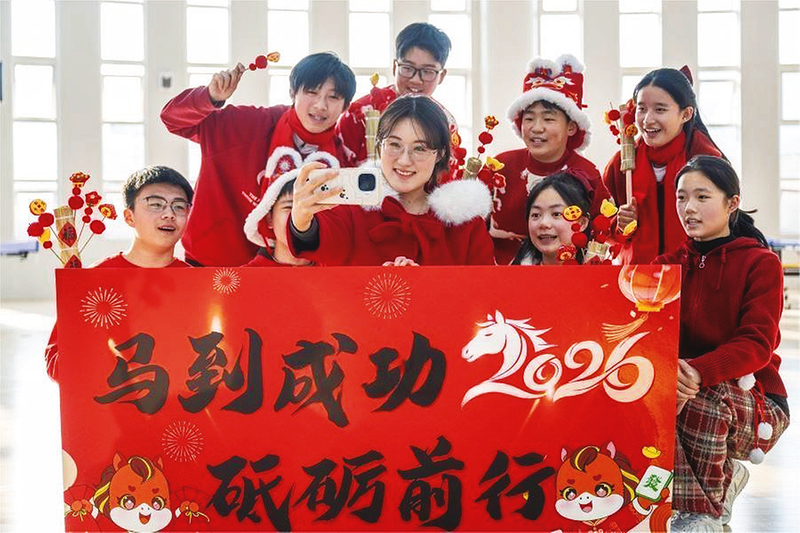 12月29日,在安徽省合肥庐阳经济开发区辖区四十五中菱湖分校,学生手持“马到成功砥砺前行”字样拍摄创意合影。当日,该校开展“庆元旦 迎新年”主题活动,师生们通过拼装灯笼、歌舞快闪、拍摄创意合影等方式,在欢声笑语中迎接2026年到来。