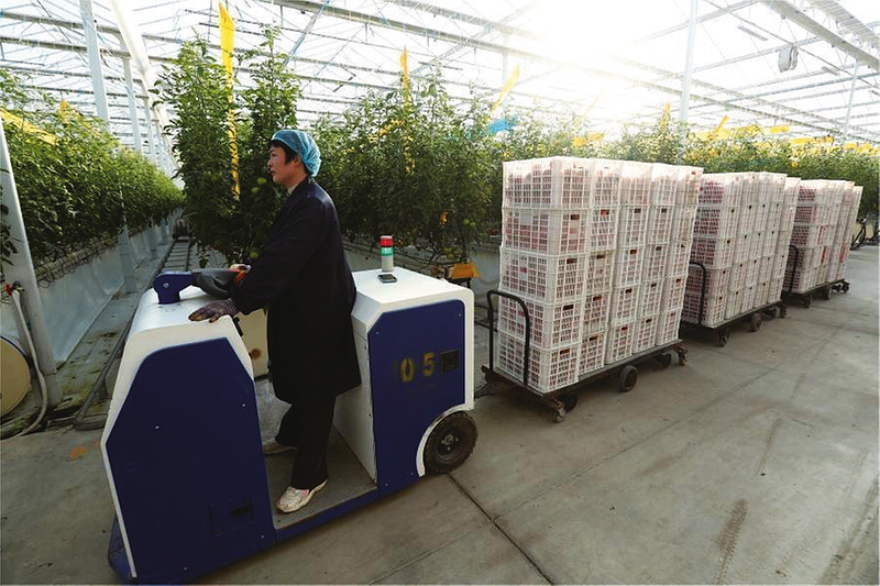 1月6日,亳州市蒙城县兴农绿港现代农业科技产业园智慧温室,工人正在搬运刚采摘的番茄。眼下,这里立体种植的番茄迎来丰收,工人们采摘后,经流水线分拣、打包,发往沪苏浙市场。近年来,蒙城县着力构建蔬菜全产业链,推动产业提质升级,打造长三角优质“菜篮子”,为乡村振兴注入新动力。