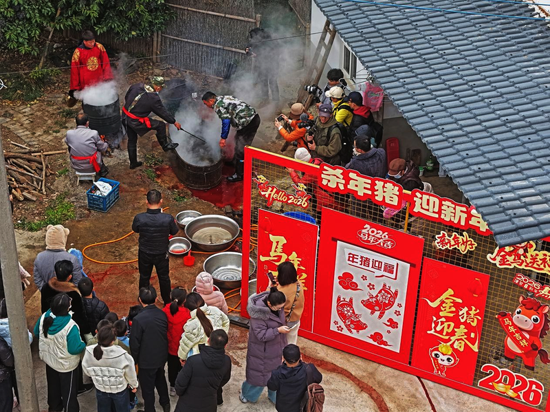1月17日,芜湖市湾沚区花桥镇鸠兹湾共富乡村举行杀年猪民俗活动,迎春纳福,欢庆新年。淳朴厚重的乡土年俗吸引了众多游客沉浸式体验乡村的年节氛围。