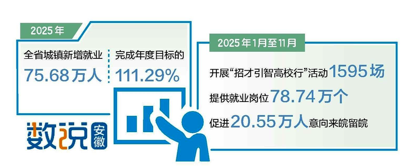 支持高校毕业生等青年群体就业,是就业工作的重中之重。去年以来,我省突出做好高校毕业生就业工作,印发《关于做好2025年高校毕业生等青年就业工作的通知》,以省政府名义召开会议部署推进。组织开展2025年“招才引智高校行”活动,去年1月至11月,全省共开展“招才引智高校行”活动1595场,提供就业岗位78.74万个,促进20.55万人意向来皖留皖。