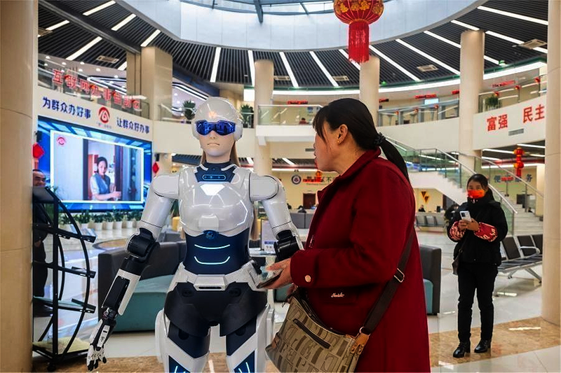 2月24日,在芜湖市繁昌区政务服务中心,智能机器人墨茵为办事群众提供服务。