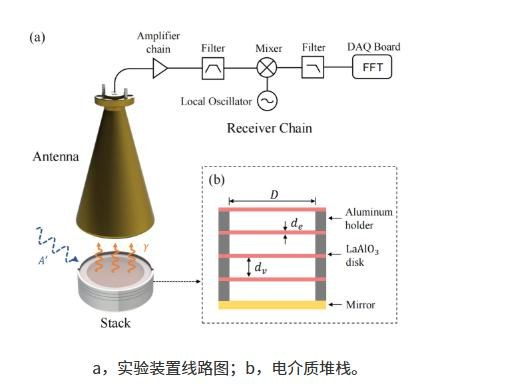 面对这一难题,研究团队设计并搭建了国际上首个工作在毫米波频段的电介质堆栈探测器。该探测器结构独特,由四层铝酸镧电介质片和一面镜子巧妙组合而成。其采用开放腔设计,这一创新设计使得它的等效模体积比普通谐振腔大约两个量级。而且,在未来还有进一步提升的空间,只需增加电介质板的数目即可。电介质片的厚度与间距经过研究团队的精心设计和反复调试,这种精心的设计使得探测器能够巧妙地利用干涉原理,显著放大暗物质激发产生的微波信号,并在W波段实现宽带搜寻。这一特性为在毫米波频段捕捉暗物质的踪迹提供了有力保障。