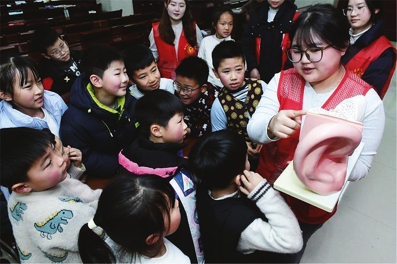 2月28日,“关爱耳朵、保护听力”主题公益活动在阜阳市颍州区京九路街道办事处陈庄社区开展,志愿者利用耳朵构造模型向小学生们讲解爱耳护耳保健知识。今年3月3日是第二十七个全国爱耳日,主题为“全民科学爱耳,共护听力健康”。