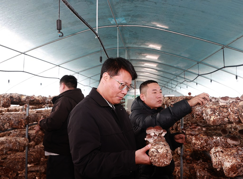 泗县大庄镇东风村驻村第一书记李海旺查看香菇长势。