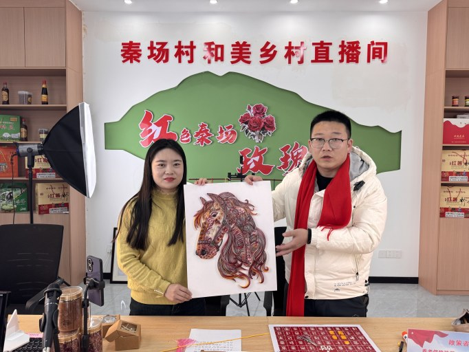 姜守云与主播共同展示盘纸作品《马》。