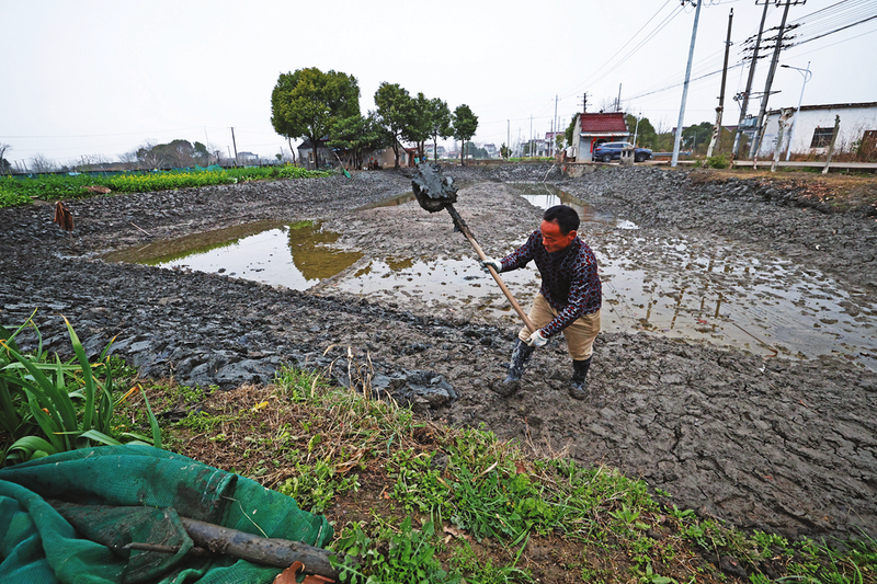 2月27日,马鞍山市当涂县黄池镇福光村,一位村民正抢抓农时,忙着清理鱼塘淤泥,为即将开始的蓄水养鱼做好充分准备。新春伊始,气温逐渐回暖,当地农户纷纷投身于春季农业生产,翻耕土地、打理塘口、育秧备耕,用辛勤的劳作绘就一幅生机勃勃的春日农耕图。王玉实 陶红霞 摄
