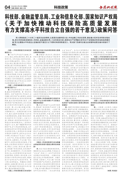 科技部、金融监管总局、工业和信息化部、国家知识产权局《关于加快推动科技保险高质量发展有力支撑高水平科技自立自强的若干意见》政策问答