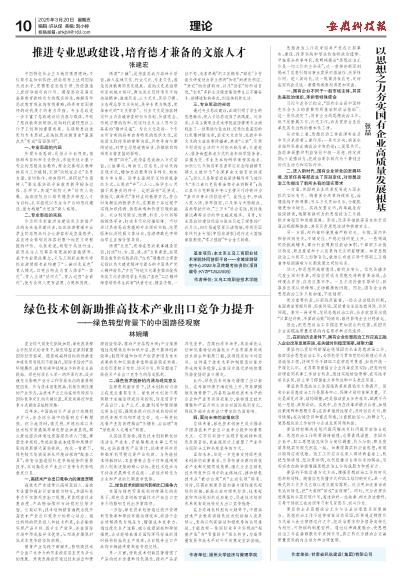 面向未来,应进一步完善支持绿色技术创新的政策体系,引导创新资源向高技术产业和关键领域集聚,强化企业在绿色技术研发和应用中的主体地位,推动绿色技术从“被动合规”向“主动引领”转变。同时,还需在制度层面加强与国际绿色规则的衔接,提高企业对绿色标准、技术规范和市场规则的适应能力,促进技术创新成果更有效地转化为出口竞争优势。