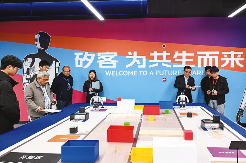 3月30日,2026年芜湖市具身智能应用创新挑战赛在鸠兹科创湾开赛。本次比赛聚焦具身智能在智能仓储场景的实际应用,集中展示芜湖机器人产业创新发展成果。图为参赛选手正在操控机器人进行智能仓储场景应用比拼。 梅韬 摄