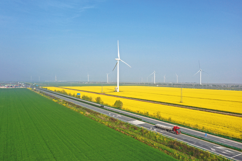 3月29日,安徽省宿松县省属农垦华阳河农场,油菜花竞相绽放,农田、道路和大风车相映成景,宛如一幅秀美的田园画卷。近年来,华阳河农场依托区域公路网交通运输优势,积极发展生态绿色农业和清洁风电能源,推动农旅融合发展,助力乡村振兴。通讯员 李龙 摄