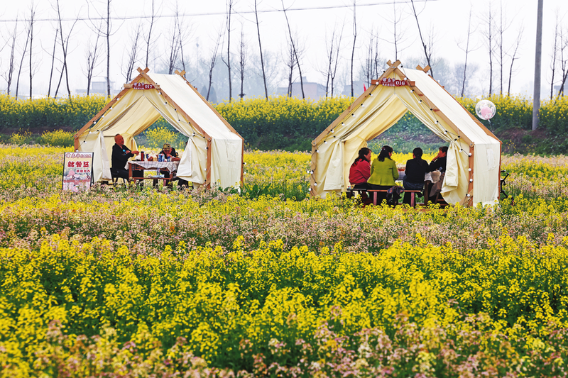 3月27日,芜湖市鸠江区白茆镇套北村,游客在油菜花海中的特色帐篷内品尝火锅,欣赏田园春色,尽享春日乡村休闲时光。近年来,芜湖市鸠江区白茆镇依托生态资源优势,积极构建“春赏花、夏采摘、秋丰收、冬民俗”的四季乡村旅游体系,通过盘活山水田园资源、丰富文旅消费场景,推动乡村旅游提质升级。王玉实 张云芳 摄